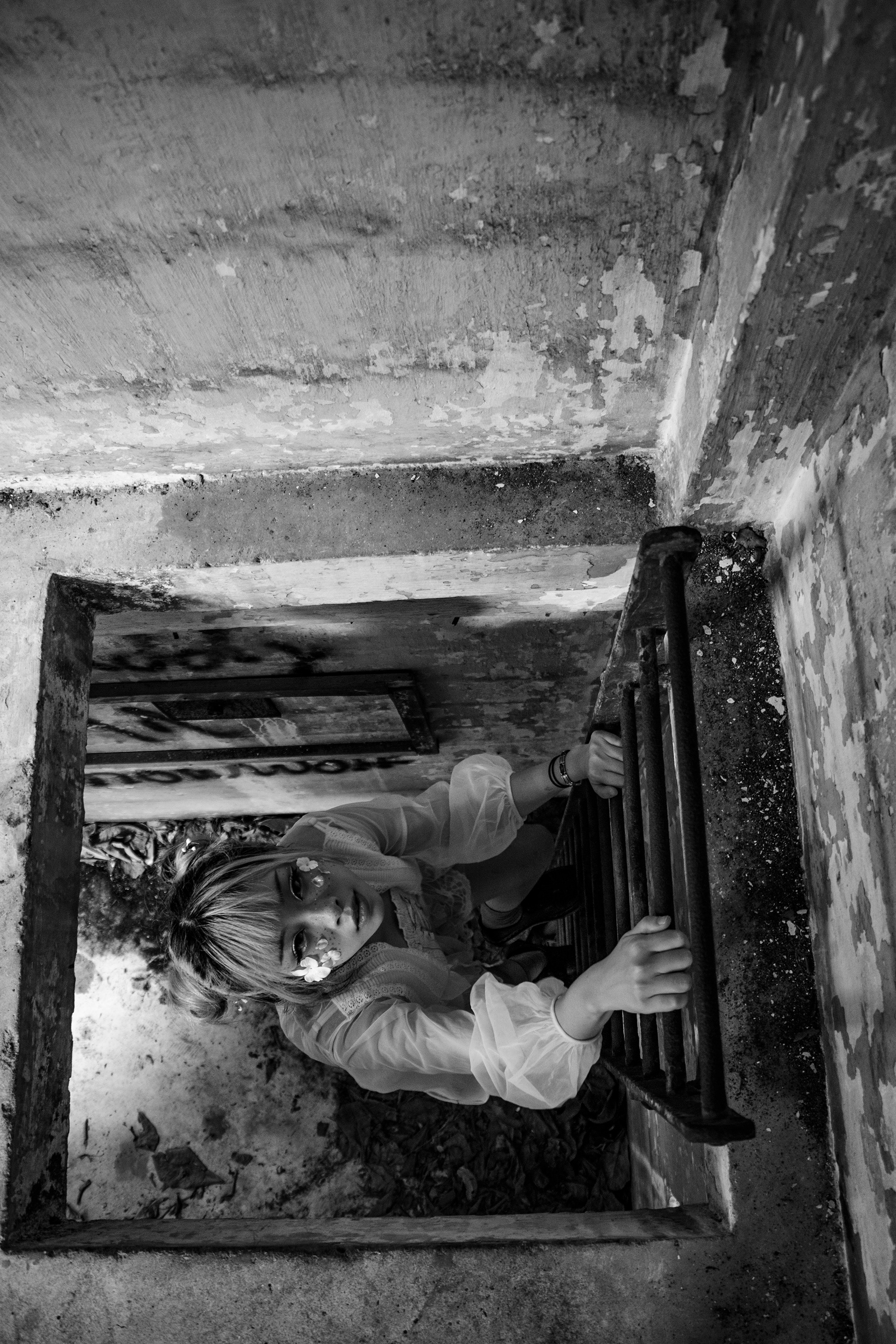 Nature slowly but surely creeps up unto the urban structure. Abandon without its human masters it is left exposed to exposure, time eroding its metal and concrete blocks. This battle ground provides the perfect play ground for a playful forrest nymph.